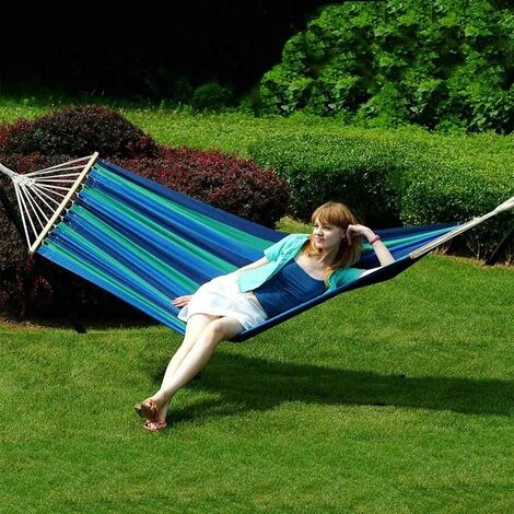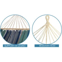 Amaca a sacco in telo di cotone molto tenace e resistente. Asse di sostegno in legno da 80 cm.