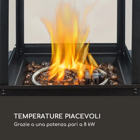 Potente e ad elevata efficienza energetica La stufa Flagranti di Blumfeldt è adatta all’utilizzo con bombole di propano o butano liquido da 5 o 11 kg, che trovano posto nello spazioso vano interno. Il dispositivo si accende in tutta semplicità , grazie al sistema di accensione elettrico integrato. Con un dispositivo di regolazione a più livelli e un tubo in dotazione con riduttore di pressione, viene regolato il flusso del gas. La stufa a gas produce fino a 8 kW di calore e riscalda piacevolmente e in maniera rapida ed efficace il luogo in cui viene posizionata oltre che le persone nelle immediate vicinanze. Al centro vi è ovviamente la notevole fiamma, che si può vedere attraverso 4 ampi oblò in vetro temperato, circondate da una suggestiva decorazione in pietra, per uno spettacolo impressionante ma privo di pericoli. Quattro rotelle facilitano lo spostamento della stufa Flagranti di Blumfeldt, mentre gli affidabili freni di stazionamento garantiscono in ogni momento la tenuta sicura della costruzione. La struttura resistente alla corrosione in acciaio inox rende il dispositivo particolarmente resistente e adatto al posizionamento nelle aree esterne. Un dispositivo di sicurezza integrato interrompe il flusso di gas al bruciatore, qualora questo dovesse ribaltarsi. Così, questo dispositivo allunga la stagione estiva di qualche mese in più, garantendo un clima piacevole.