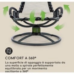 Il divano a dondolo Blumfeldt The Chiller è stato progettato esattamente per questo scopo. 360 Comfort è il nome del progetto, che vi rende felici: il divano oscilla dolcemente su una molla a spirale perfettamente bilanciata che consente movimenti oscillanti in tutte le direzioni. La comoda superficie di appoggio in ComfortMesch permeabile all’aria ha una forma ergonomica che invita al relax, e offre una sensazione di piacevole conforto per la schiena. Le coperture in gomma rendono comodo il telaio dei braccioli.Â