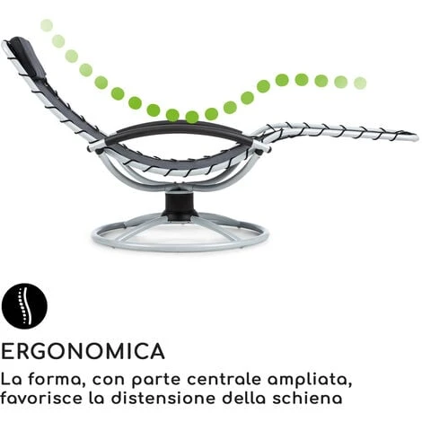 Il divano a dondolo Blumfeldt The Chiller è stato progettato esattamente per questo scopo. 360 Comfort è il nome del progetto, che vi rende felici: il divano oscilla dolcemente su una molla a spirale perfettamente bilanciata che consente movimenti oscillanti in tutte le direzioni. La comoda superficie di appoggio in ComfortMesch permeabile all’aria ha una forma ergonomica che invita al relax, e offre una sensazione di piacevole conforto per la schiena. Le coperture in gomma rendono comodo il telaio dei braccioli.Â