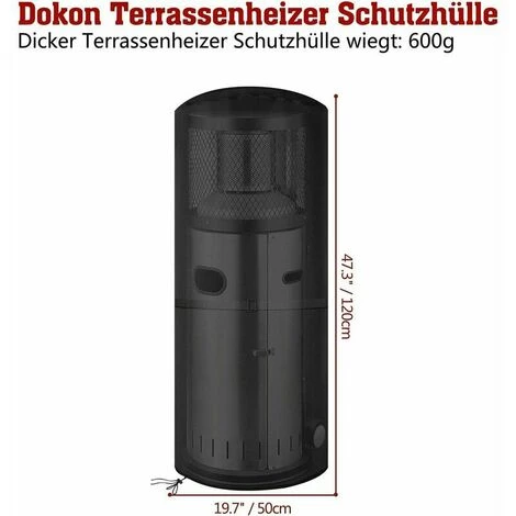 Dimensioni: 50 cm di diametro x 120 cm di altezza è la dimensione disponibile della copertura protettiva del radiatore. Controlla il tuo riscaldatore da esterno per trovare la taglia giusta. La copertura si adatta alla maggior parte dei riscaldatori da terrazza rotondi.