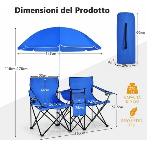 - Con un ombrellone rimovibile, un mini tavolo e un porta bevande, questo set di sedie è perfetto per le coppie che vogliono fare un fare picnic in cortile con grande comodità.