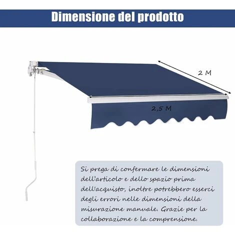 - Montaggio facile:La tenda da sole può essere montata sia sui muri di cemento che sulle costruzioni in mattone. E nella confezione sono incluse tutte le parti necessarie e le istruzioni dettagliate per montare facilmente e in poco tempo. In più, se Lei trova qualche problema, non esiti a contattarci. Grazie per la Sua pazienza. Nota bene: prepara il trapano con le punte, lo scotch e le chiavi inglesi (non inclusi) prima di iniziare a montare.