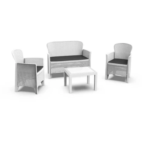 STRUTTURA E UTILIZZO – Articolo formato da un elegante set da esterno per due persone, composto da due sedie con schienale e braccioli, un divano a due posti ed un tavolino, cuscini inclusi – Le sedute spaziose ed accoglienti garantiscono relax e comodità in casa propria – Salottino perfetto per arredare il proprio spazio outdoor o indoor, grazie alla composizione in plastica rinforzata con effetto rattan che ne accresce lo stile – Perfetto per brunch ed aperitivi in terrazzo, veranda, giardino o per rilassarsi a bordo piscina.