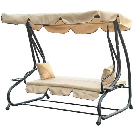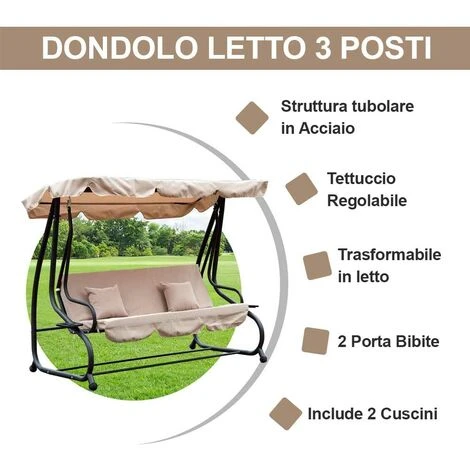 1 x Dondolo Letto da Giardino 3 Posti Tetto Reclinabile Cuscini Beige 235x126x170cm