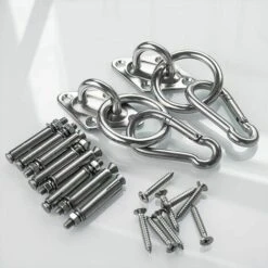 Questo kit di supporto per amaca comprende 2 occhielli rotondi con anello, 4 bulloni a testa tonda per legno e una vite di espansione per cemento, 2 moschettoni a molla per una qualità ottimale.