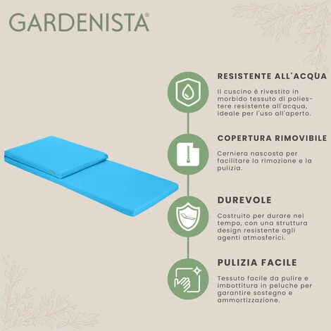 Materiale e imbottitura di qualità : il cuscino per lettino prendisole Gardenista è realizzato in tessuto 100% poliestere di alta qualità , morbido e resistente. I cuscini sono progettati per resistere alle intemperie e mantenere la loro forma e colore anche dopo un uso prolungato. L’imbottitura utilizzata nei cuscini è una fibra di prima qualità che offre comfort e sostegno eccellenti. La fibra è morbida ed elastica, consentendo ai cuscini di conformarsi ai contorni del corpo fornendo allo stesso tempo un ampio supporto.