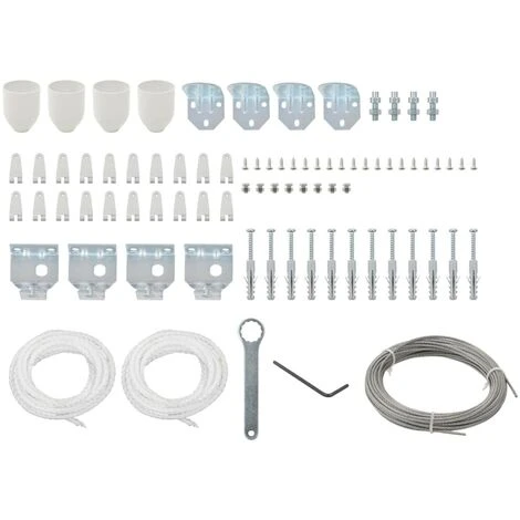 Questo set di accessori è adatto per qualsiasi tenda da sole da 270 cm. La consegna include 1 cavo in acciaio, 2 corde tiranti, 4 set di staffe angolari, 20 ganci e altri accessori di montaggio come bulloni, viti, dadi, ecc.