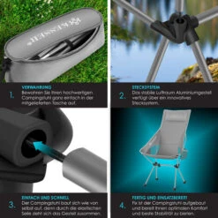 Sedia da campeggio KESSER in tessuto in poliestere traspirante e idrorepellente, il robusto telaio in alluminio garantisce una capacità di carico fino a 120Kg, Incl. accessori extra come portabevande integrato, borsa per la custodia, tasca laterale e moschettone.