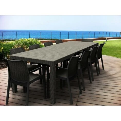 Il tavolo da pranzo moderno, molto resistente grazie alla sua struttura 100% in resina con allungo in alluminio, è ideale per organizzare feste e barbecue in famiglia.