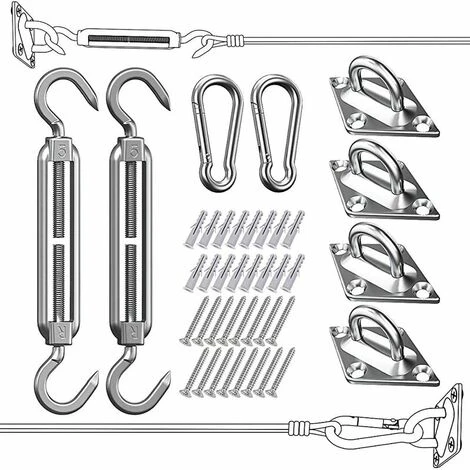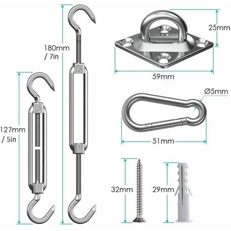 COSTRUITO PER LA DURATA E L’AFFIDABILITÀ: il kit di montaggio per vela a 5 otturatori EVERSEE è realizzato in acciaio inossidabile 304 di alta qualità che resiste alla ruggine e alla corrosione. La lunghezza del tenditore può essere regolata da 5 a 7. Il kit di ferramenta è robusto e resistente alle intemperie. I kit di ferramenta per vele ombreggianti sono essenziali per appendere all’aperto vele ombreggianti rettangolari o quadrate. .