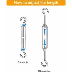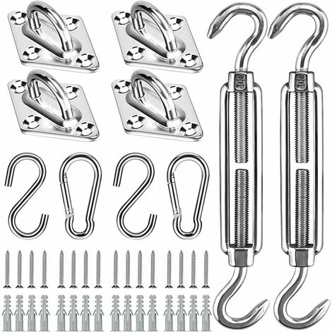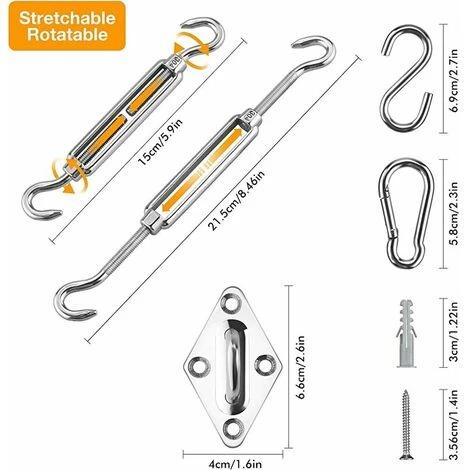 [Resistente alla ruggine di alta qualità ]: il kit di fissaggio della vela parasole è realizzato in acciaio inossidabile 304 di alta qualità . sostenibile. resistente alla corrosione e antiruggine. ed è progettato per uso esterno. [Tensore regolabile]: il kit di fissaggio della vela parasole ha un tenditore regolabile. che consente di tendere la vela durante l’installazione. Hai due opzioni: da (5 pollici) 115 mm a 165 mm o da (6 pollici) 150 mm a 215 mm. [Elevata capacità di carico]: il kit di montaggio per vele ombreggianti per impieghi gravosi è progettato per migliorare la durata e l’affidabilità . e può resistere meglio a forti piogge e forti venti. Goditi il fresco dell’estate in giardino. [Facile da installare]: il kit di fissaggio della vela parasole è facile da usare sul muro a secco. i muri di cemento. in mattoni, legno e cemento e altre strutture solide. e può ospitare qualsiasi tipo di vela ombreggiante. installa facilmente il tuo posto preferito. [Incluso nella confezione]: il kit di fissaggio della vela ombreggiante è dotato di 2 tenditori regolabili. 2 passanti per moschettone. 2 ganci a S. 4 occhielli per cuscino. 16 viti e 16 prolunghe in plastica.