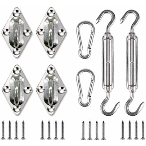 Utile set di accessori per tende da sole: set di montaggio in acciaio inossidabile per il baldacchino. Collegamento tra il supporto, la parete e la vela solare. Adatto per terrazza e giardino. Dettagli: – Materiale: acciaio inox. – Peso: 380g – Per un fissaggio sicuro e una tensione ottimale. – Diametro dei singoli pezzi: ciascuno 5 mm. – Staffa a parete: forma a diamante, spessore del pannello: 2mm, spessore del corpo: 5mm, foro: circa 5mm. – Moschettone: Lunghezza: 5 cm. – Tensione della vite: Intervallo 130-180 mm. Il set comprende 4 staffe a parete, 4 moschettoni, 4 viti di tensione e 16 viti