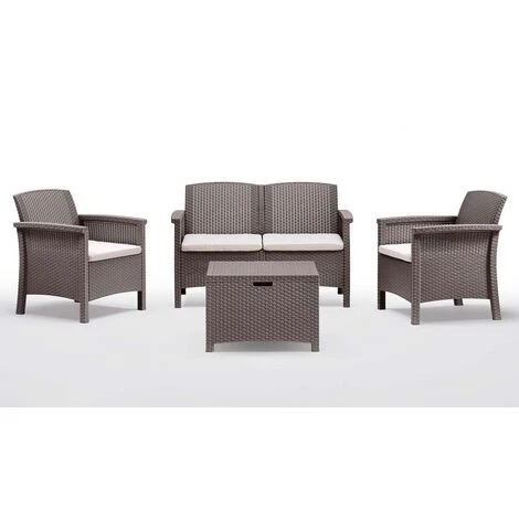 Salottino da giardino per 4 persone, kit in polipropilene TORTORA completo di cuscini. Il kit comprende 2 poltrone, 1 divanetto a 2 posti e 1 tavolino contenitore. Perfetto per terrazze e giardini, resistente alle intemperie, non scolorisce. Stampato in elegante finitura rattan. Peso complessivo 34Kg. Consegna tramite corriere.