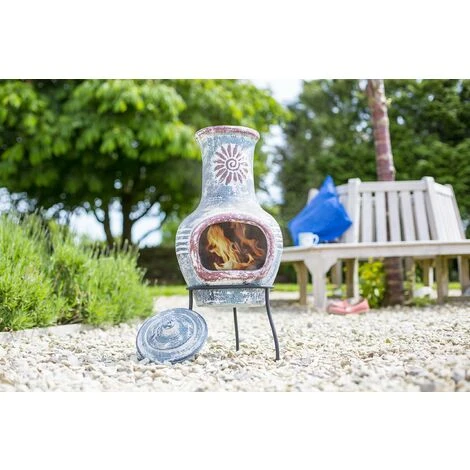Questo attraente camino in argilla è il modo perfetto per aggiungere calore e stile al tuo spazio esterno. È stato realizzato a mano in argilla e dipinto a mano in una bella finitura blu mare e rosso con intricato motivo a ricciolo sulla canna fumaria. Perfetto per riscaldare gli allestimenti all’aperto, questo camino viene fornito completo di coperchio antipioggia e supporto in acciaio massiccio.