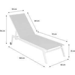 Sdraio allungata: Lunghezza 191,5 x larghezza 55 x altezza 31 cm / Sdraio con schienale rialzato nel punto più alto: larghezza 168 x lunghezza 55 x altezza 94 cm