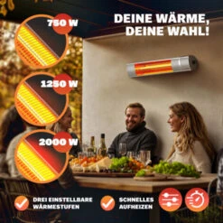 Il moderno riscaldatore radiante da 2000 W di Monzana® consente di riscaldare in modo efficiente e rapido, all’aperto senza preriscaldamento. Il vantaggio del dispositivo è che i raggi infrarossi vengono utilizzati per riscaldare senza odori e senza rumori. Con il telecomando puoi scegliere tra 3 livelli di calore e controllare individualmente il calore attraverso l’angolo di inclinazione regolabile a 90°.