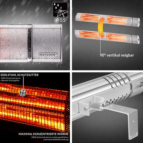 Il moderno scladino elettrico da 3000 W di Monzana® riscalda in modo rapido ed efficiente l’ambiente circostante, sia in casa che all’aperto, senza preriscaldamento. I raggi infrarossi emanano inoltre un calore inodore, silenzioso e senza sollevare polvere o sporco inutilmente: particolarmente igienico e adatto quindi a soggetti allergici.