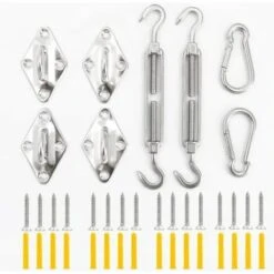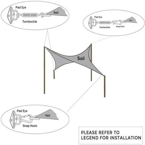 - 2. Tenditore regolabile: il kit di vele ombreggianti ha un tenditore regolabile per creare tensione in modo che le vele siano tese durante l’installazione. Puoi scegliere la distanza della tua vela ombreggiante dal muro/palo/punto a cui è fissata, lunghezza da 5 a 7