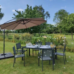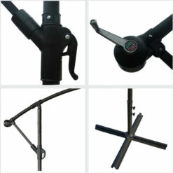 Per quanto riguarda gli accessori, è necessario aggiungere lastre appesantite o riempibili per garantire che l’ombrellone rimanga a terra. Happy Garden consiglia inoltre di proteggere l’eccentrico ombrellone con una copertura quando non lo si utilizza per preservarlo dalle intemperie.