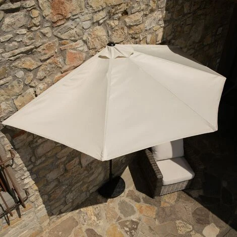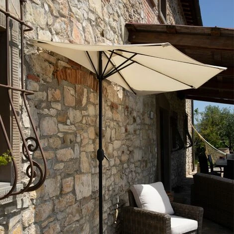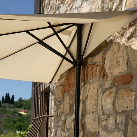 Pensato per balconi e terrazzi, un ombrellone da balcone a forma di mezzaluna, così da poter essere montato a ridosso della parete di casa, senza rubare spazio. Con robusto tubo in acciaio verniciato a polvere e telo impermeabile in poliestere, si apre e chiude facilmente grazie alla manovella integrata. Per colazioni o pranzi all’aria aperta, anche in piccoli spazi, riparandosi dai raggi diretti del sole! Utilizzalo con la base in cemento, cod. 509381. L’ombrellone da balcone misura 270 x 240 x 140 cm.