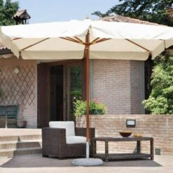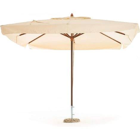 Struttura in legno, stecche in legno, telo in poliestere, fessura antivento, parasole, col. ecrù.Dimensioni: mt. 3×4 (Ø tubo mm. 48 – 8 stecche)N.B. BASE IN CEMENTO NON PRESENTE