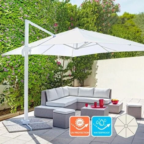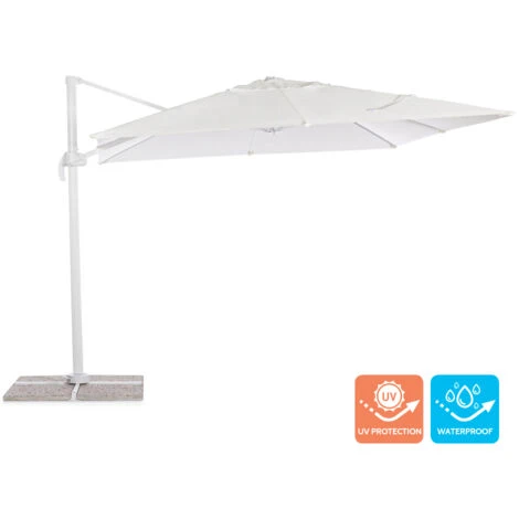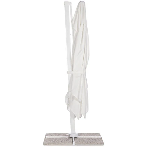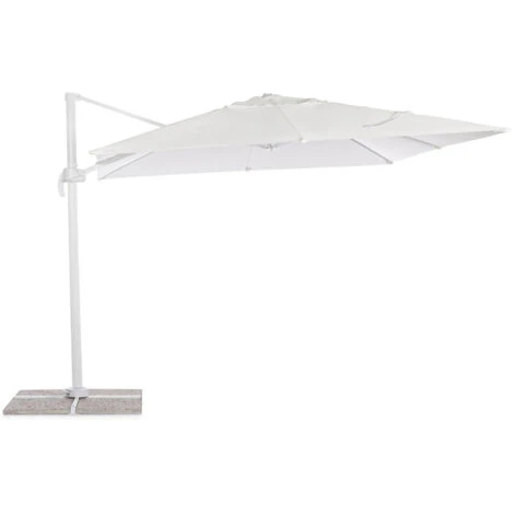 La configurazione a braccio decentrato consente svariate regolazioni: grazie alla pratica manovella posizionata sul palo laterale e al pedale sulla base, l’ombrellone Paradise White si inclina e ruota a 360° per seguire il movimento del sole nel corso della giornata e creare così la perfetta zona d’ombra. L’apertura del telo attraverso il sistema a carrucola, permette la chiusura retrattile vicino al sostegno laterale, è azionabile facilmente da una sola persona in pochi secondi, con il telo che compre una superficie pari a 3 metri per 3.