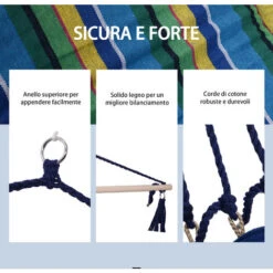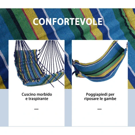 Poltrona sospesa da giardino Outsunny facile da legare ad un albero o ad un supporto. L’ampia seduta e il supporto per i piedi assicurano il massimo del comfort. Realizzata con tessuto di cotone e poliestere durevole e supporto superiore resistente a un peso massimo di 100kg.