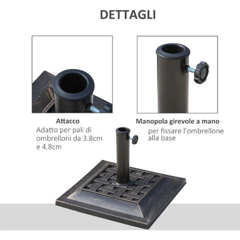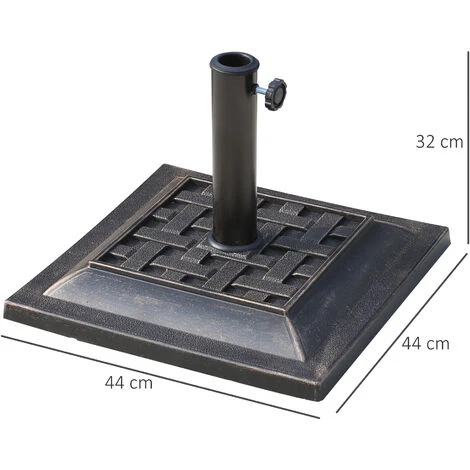 Il basamento per ombrellone Outsunny è funzionale e chic. Ha un’elegante finitura color bronzo che dona un tocco vintage al tuo arredamento da giardino. Realizzato in resina e acciaio, la base per ombrellone assicura stabilità e resistenza per durare a lungo negli anni.