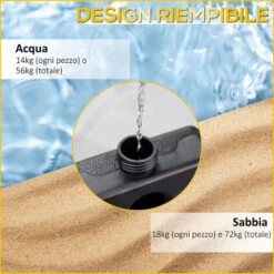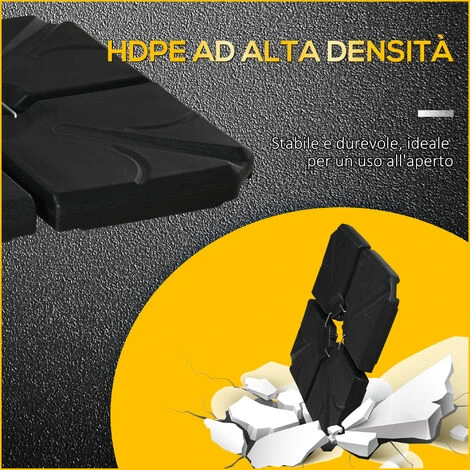 Assicurati che il tuo ombrellone sia sempre tenuto saldamente in posizione con questa base per ombrellone Outsunny. Realizzata in robusta plastica HDPE, è composta da quattro pezzi che si incastrano facilmente. Riempili con acqua e sabbia per renderli stabili e, quando non ti servono più, puoi svuotarli facilmente e riporli. Scegli il basamento per ombrellone e rendi più stabile il tuo parasole, per goderti le belle giornate all’ombra.
