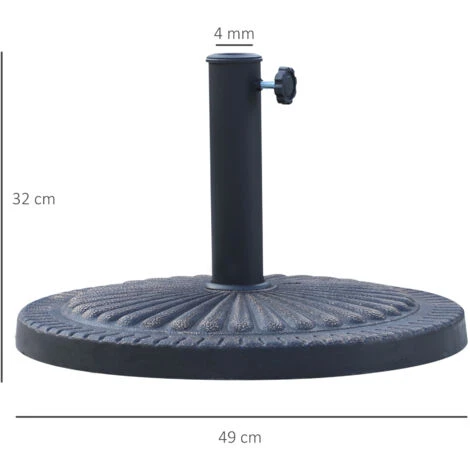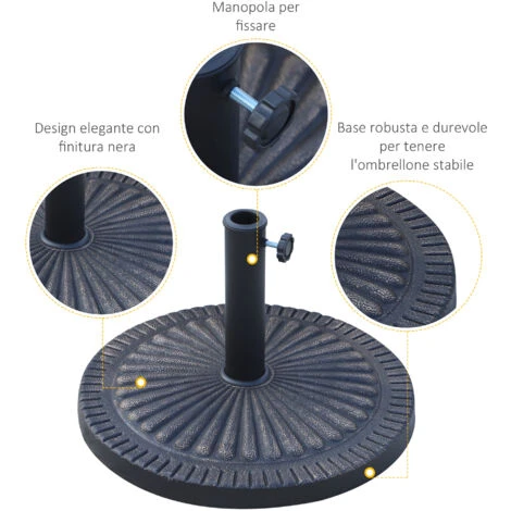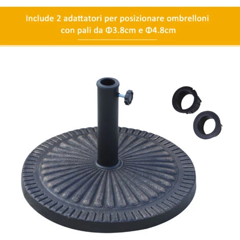 Tieni al tuo sicuro il tuo ombrellone con questa base ombrellone Outsunny. Realizzata in resina e metallo, è resistente alle intemperie e include una manopola per fissare ombrelloni con palo da Ø3,8 e Ø4,8 cm. L’elegante incisione rende il basamento funzionale e decorativo per i tuoi spazi aperti. I 14 kg di peso evitano che la base di appoggio per ombrellone venga spostata dal vento.