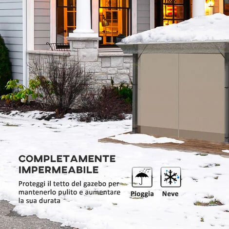 Il tempo non può sempre essere soleggiato: quando si va incontro a pioggia o neve e si deve comunque utilizzare il gazebo o il tettuccio si rivela più difficile del previsto da togliere, è necessaria la nostra copertura per gazebo Outsunny. Realizzata in PVC completamente impermeabile, può essere fissata saldamente al tettuccio del tuo gazebo attraverso il cordino antivento che impedisce all’acqua piovana di infiltrarsi.