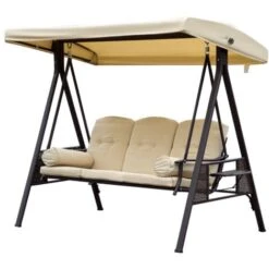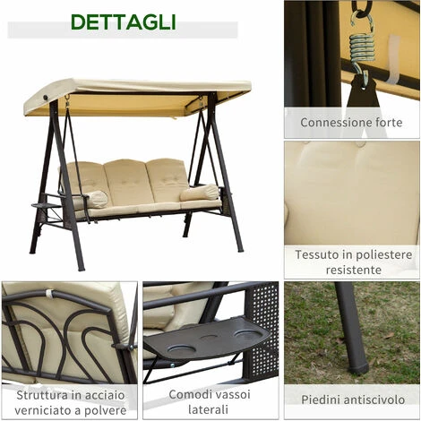 Outsunny ti presenta questo dondolo da giardino elegante e confortevole. La seduta e lo schienale sono imbottiti con uno spesso cuscino, per ospitare comodamente 3 persone. Il tetto è inclinabile e ti permette di inclinarlo all’angolo giusto per proteggerti dal sole. I pratici vassoi sui lati ti permettono di tenere a portata di mano i tuoi drink mentre ti rilassi. Questo dondolo 3 posti è perfetto per il giardino, il patio, la terrazza e ovunque tu voglia creare un’oasi di relax.