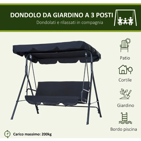 Dondolo da giardino dal design classico ed elegante, offre il massimo comfort durante le giornate estive. Dispone di una seduta ampia e comoda. Adatto per 2 o 3 persone. Ideale per il vostro giardino, terrazzo, patio ecc. Realizzato con materiali di elevata qualità e con una lavorazione di prima classe. Robusta struttura in acciaio verniciato a polvere, potrà essere utilizzato per lungo tempo senza rovinarsi. Il tettuccio parasole con angolo regolabile permette di ripararsi bene dal sole.