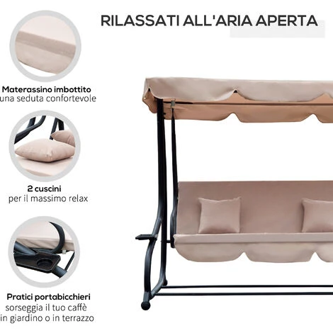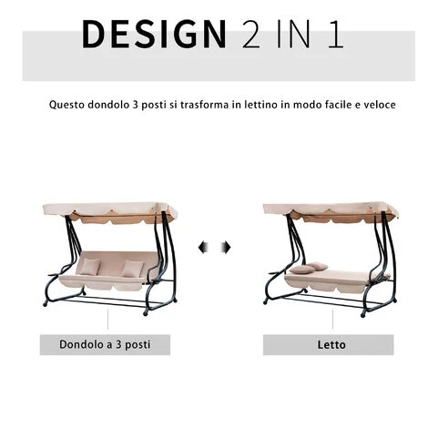 Il dondolo da giardino Outsunny è ideale per ogni casa. È realizzato con una solida struttura in acciaio e ha una seduta confortevole con materassino imbottito. Ti offre il massimo del relax grazie alla seduta con 3 posti che si trasforma in un attimo in letto a dondolo. Il tetto parasole regolabile ti protegge dai raggi del sole e i vassoi laterali ti offrono un comodo spazio per tenere le tue bevande. Preparati a goderti ogni momento all’aria aperta con questo dondolo letto da giardino!