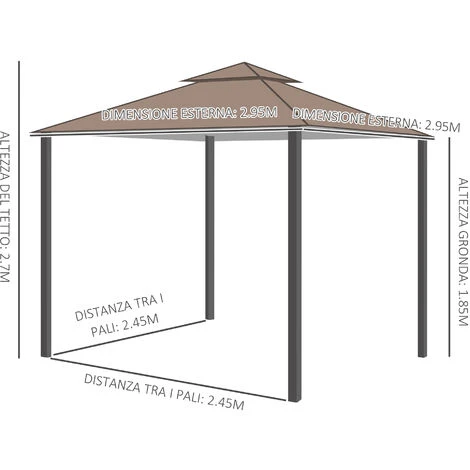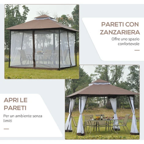 Il gazebo in metallo Outsunny è la struttura che serve ai tuoi spazi aperti. Il telaio in metallo e la copertura in poliestere assicurano resistenza e protezione dal sole e dai raggi del sole. Le pareti con zanzariera ti permettono di godere dei momenti all’aria aperta senza il fastidio degli insetti. Puoi posizionare un tavolo con sedie, delle sdraio o un dondolo sotto a questo gazebo da giardino per rilassarti in compagnia durante le belle giornate.