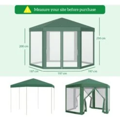 Avete bisogno di un luogo ombreggiato dove potete ripararvi dal sole o dalla pioggia all’aperto? Il nostro gazebo esagonale moderno è la scelta perfetta per qualsiasi attività , festa, riunione in giardino o in campeggio. Fornisce un’ombra fresca e protegge efficacemente dagli insetti grazie alle 6 zanzariere. Realizzato in tessuto di poliestere. Robusta struttura in metallo con vernice a polvere. Lavorazione di prima classe, con protezione da deformazione, corrosione e ruggine. Facile da montare grazie alle istruzioni incluse.