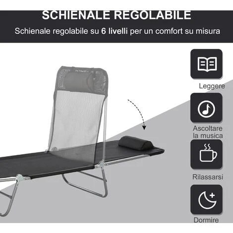 Rilassati sul lettino prendisole Outsunny e goditi ogni momento all’aperto! Perfetta come sdraio da giardino, al mare o in campeggio, questa sdraio pieghevole è facile da trasportare e si ripone in poco spazio quando non ti serve. La struttura in acciaio è solida e stabile e il lettino è in tessuto traspirante. Con lo schienale regolabile su 6 inclinazioni e il cuscino incluso, puoi trovare il livello di comfort su misura per te!