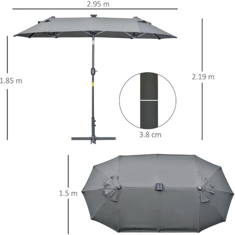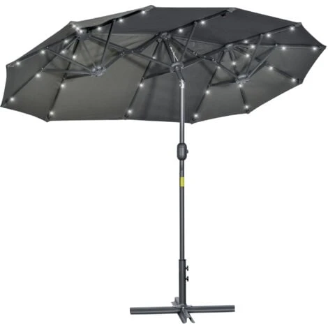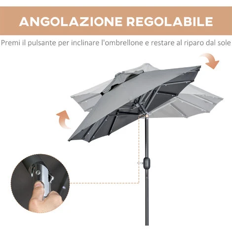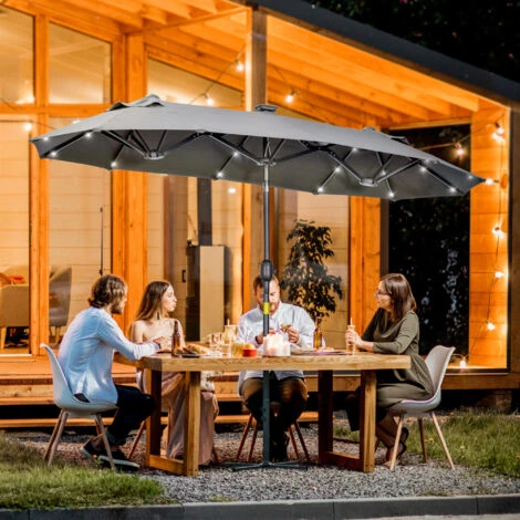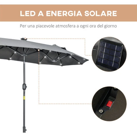 L’ombrellone doppio Outsunny quando cala il buio, illumina le tue serate con le luci LED sulle stecche. Le luci sono alimentate con un pannello solare, così risparmi e non hai bisogno di elettricità . Si apre e chiude facilmente grazie alla manovella posizionata sul palo e puoi inclinare il tettuccio per ripararti dal sole a ogni angolazione. Continua la tua giornata anche di notte sotto questo ombrellone!