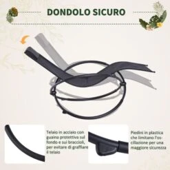 Questa sedia a dondolo Outsunny dal design innovativo porterà comodità e stile al vostro spazio esterno. La forma unica garantisce la massima stabilità senza rinunciare al comfort. Facile da pulire e mantenere. Resistente alla pioggia leggera. Telaio in acciaio durevole e stabile. Design pieghevole per un facile trasporto.