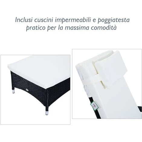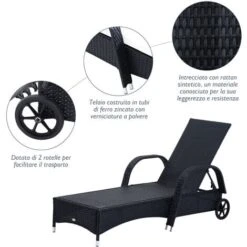 Questo eccellente set realizzato in rattan sintetico di alta qualità renderà più bello il vostro giardino. Composto da 2 sedie a sdraio e un tavolino grazioso. Molto moderno e funzionale. Ha una struttura robusta ed ergonomica. Telaio costruito in tubi di ferro zincato con verniciatura a polvere. Si può regolare in altezza a 5 livelli, così da avere a disposizione tutte le posizioni, da una comoda sedia a un lettino. Grazie alle rotelle pratiche la sedia a sdraio sposta facilmente. Vengono forniti anche di cuscini e poggiatesta. Il nostro set che offre tutto il necessario per una pausa rilassante potrete non potete farne meno!