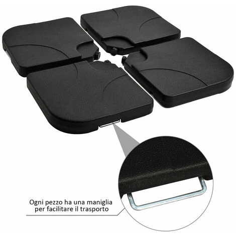 Questo set di 4 pezzi base per ombrellone è un’ottima scelta per evitare che il proprio ombrellone venga portato via dal vento. Realizzato in plastica HDPE, molto resistente e duraturo nel tempo. Ogni pezzo può essere riempito con acqua o sabbia per renderlo più stabile. Grazie al suo sistema modulare, risparmia tanto spazio quando non viene usato. In più, ogni pezzo dispone di una maniglia sul lato per facilitare il trasporto.
