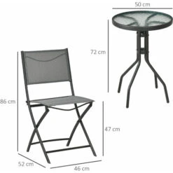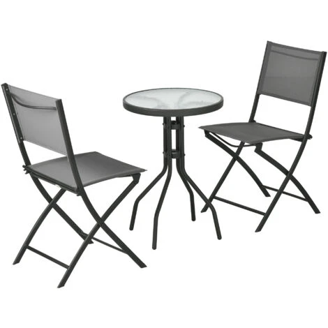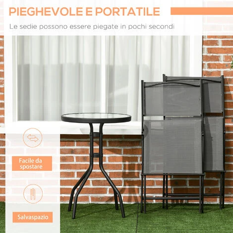 Aggiungi della bellezza ai tuoi spazi esterni con questo set da giardino Outsunny da tre pezzi. Il set è composto da un tavolo rotondo con piano in vetro temperato e da due sedie da giardino, entrambe con seduta e schienale in tessuto a rete traspirante per restare al fresco all’aperto. Il set tavolo e sedie, realizzato con un telaio in acciaio verniciato a polvere, si rivela solido e robusto. Le sedie moderne, leggere e pieghevoli, possono essere facilmente trasportate in giro.