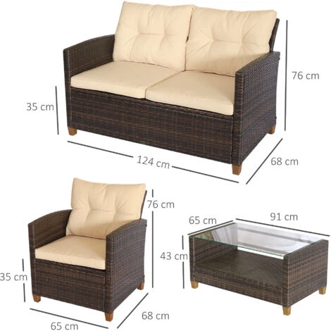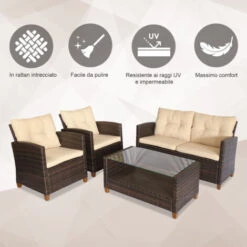 Il set di mobili in rattan Outsunny composto da 4 pezzi è la soluzione perfetta per rinnovare il tuo arredamento da giardino. È composto da un divano da giardino a 2 posti, 2 poltrone da esterno e un tavolino in rattan, che puoi comporre come preferisci per usarli tutti insieme o separatamente. Il tavolo ha un design elegante con ripiano in vetro temperato e mensola inferiore. La struttura stabile in metallo e rattan PE dei mobili assicura una lunga durata e resistenza alle intemperie.