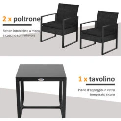 Questo set mobili da giardino a 3pz in stile contemporaneo è progettato per offrire un posto piacevole per il vostro giardino, balcone, terrazzo, patio o veranda. Composto da un tavolino e 2 sedie con cuscini morbidi. Realizzato in rattan sintetico dal design moderno e con telaio costruito in tubi metallici con verniciatura a polvere. Grazie all’alta qualità dei materiali ha un’elevata resistenza agli agenti atmosferici e alle intemperie.
