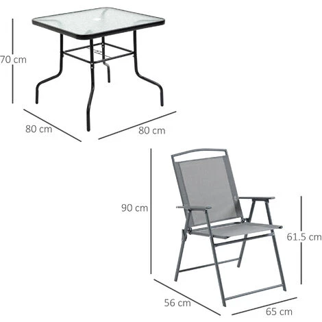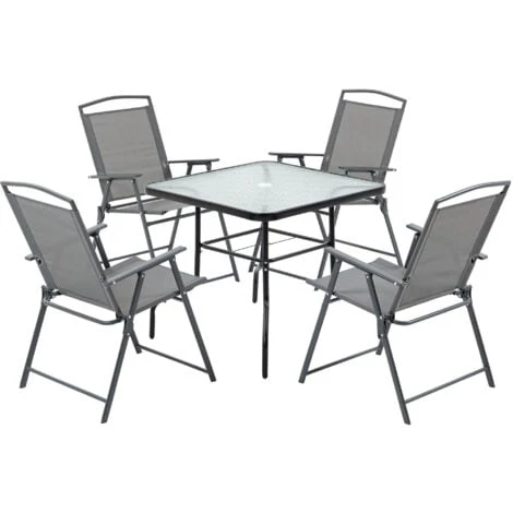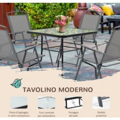 Lascia che questo set tavolo e sedie da giardino Outsunny sia il tuo elemento in più per le tue attività e il tuo relax all’aperto. La struttura delle 4 sedie e del tavolo in metallo robusto e il piano d’appoggio in vetro temperato garantiscono solidità ed eleganza. Il tessuto a rete delle sedie consente alla pelle di respirare per farti sedere comodamente. Un’aggiunta perfetta per i pomeriggi e le serate estive.