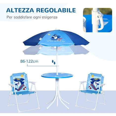 Il set da giardino per bambini Outsunny composto da 4 pezzi abbinati è pensato per offrire ai più piccoli uno spazio su misura per mangiare, giocare e passare il tempo all’aperto. Include un ombrellone, un tavolo e 2 sedie per bambini, con un simpatico e colorato design che ravviva gli spazi esterni. I bambini lo adoreranno perché è pensato espressamente per loro!