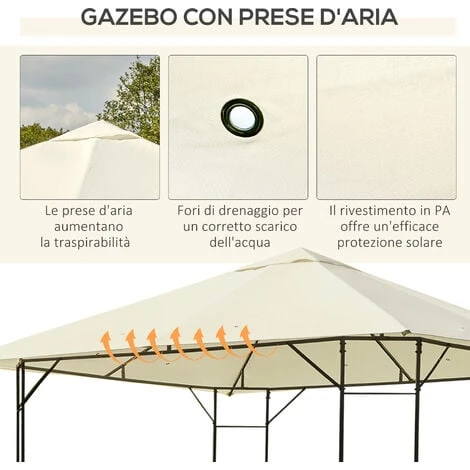 Gazebo da giardino Outsunny dal design elegante, ideale per feste all’aperto. Struttura in acciaio verniciato a polvere. Doppio tetto stabile e ben fissato per una buona circolazione dell’aria. Resistente alla pioggia e ai raggi UV. Adatto a feste, eventi all’aperto o per trascorrere ore di relax in giardino. È richiesto il montaggio.