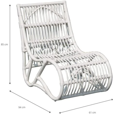 Aggiungi un angolo relax al tuo giardino con questa splendida poltrona bassa in rattan naturale. Comoda seduta, unisce design e comfort grazie alla sua forma curva che consente di proteggere la schiena. Tonalità bianca, colore neutro che la rende adatta a qualsiasi tendenza decorativa, divertiti a combinarla con le altre poltrone Chillvert per avere un giardino alla moda e con stile.nQuesta seduta è il complemento di cui hai bisogno per il tuo terrazzo o giardino, puoi posizionarla accanto alla piscina, sul prato o su un ampio terrazzo per prendere il sole.nQuesta poltrona è il complemento di cui hai bisogno per il terrazzo o giardino, puoi collocarla accanto alla piscina, sul prato o su un ampio terrazzo per prendere il sole. L’uso di mobili realizzati con materiali naturali è una tendenza ricorrente nelle nuove decorazioni, consente di creare stile accompagnato dal buon gusto.nPuoi anche utilizzarla in interni, ad esempio in una stanza in stile coloniale, nordico o esotica, per rilassarti o creare un angolo  lettura.nnCaratteristiche:n- Dimensioni: 61 x 94 x 85 cm.n- Materiale: rattan naturale.n- Cuscino: No.n- Colore bianco.n- Peso totale: 6,5 kg.n- Peso consentito: 120 kg.n- Adatto per: interni ed esterni.nn* Non necessita di montaggio e manutenzione. Per evitare il deterioramento dovuto a sole o pioggia , si consiglia di applicare 2 o 3 strati di vernice trasparente in rattan una volta all’anno. Il rattan può essere pulito ogni 3 mesi con acqua calda e qualche goccia di ammoniaca, risciacquare, asciugare, applicare olio di lino e lucidare con un panno morbido.