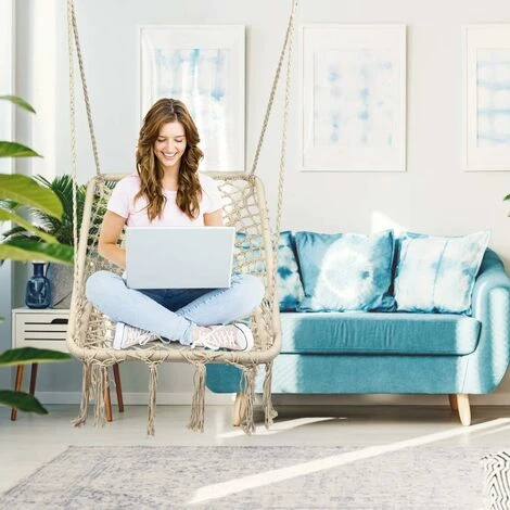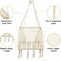 Questa sedia amaca in macramè è sia bella che pratica e ti permette di goderti il tempo libero all’esterno e di decorare la casa. Realizzata con corde intrecciate di alta qualità e con una struttura in acciaio resistente, è sicura e durevole. I due ganci in acciaio e il sedile sono collegati da 4 corde che aumentano la stabilità e forniscono un supporto stabile. Il sedile a rete è morbido e delicato sulla pelle, si adatta alla curva del corpo e ti fa sentire comodo. In stile bohemien e nordico, si abbina allo stile decorativo della casa. È leggera e portatile e si sposta facilmente ovunque. Si può usare come altalena o come sedia per meditare in cortile, giardino o camera da letto.